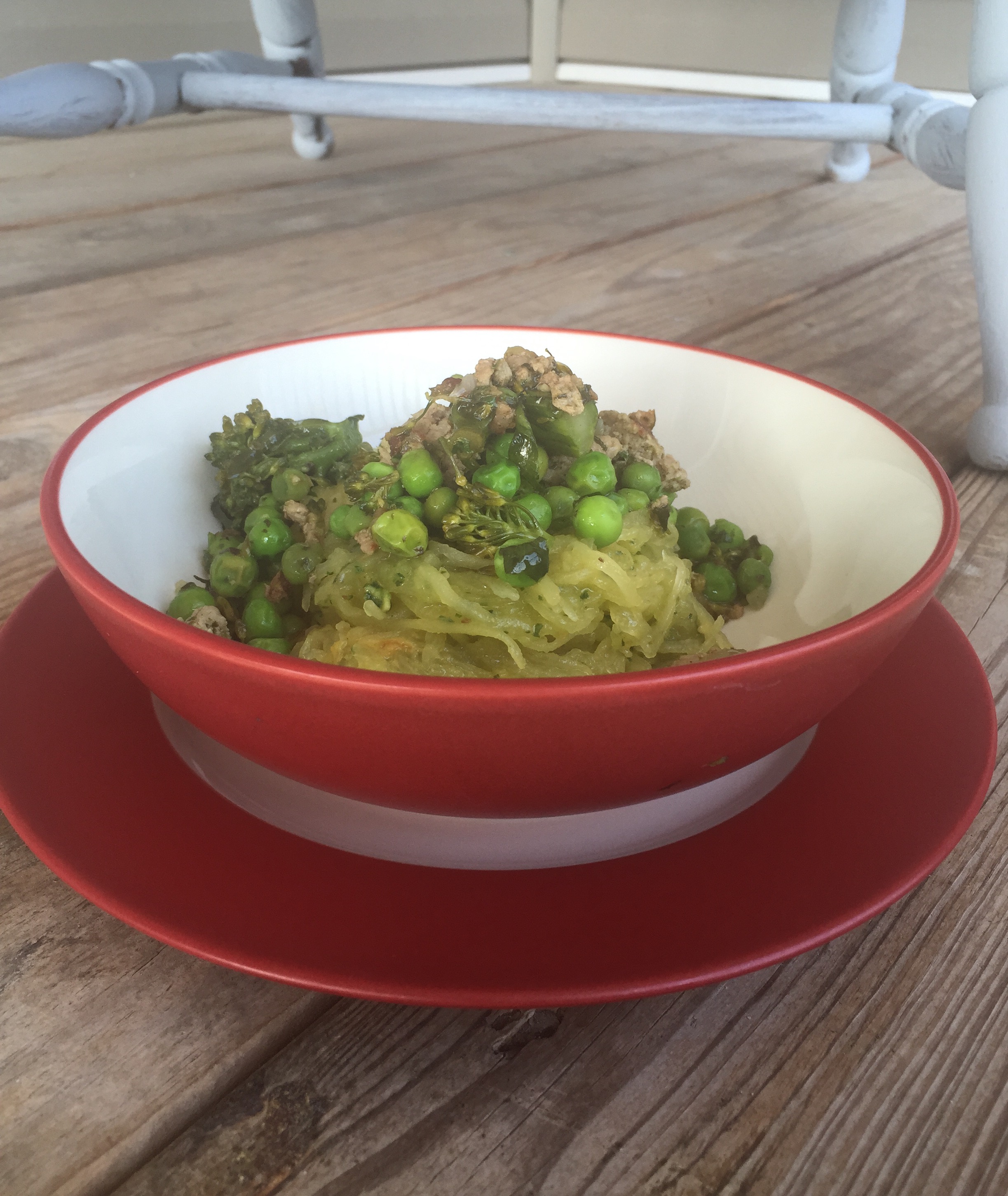 Spaghetti squash has become quite popular lately. I have to admit, I am not a fan of it all the time but this combo is a great mix of flavors. Turkey sausage is a much healthier choice than pork sausage and the loaded greens in this dish boost the nutrition.