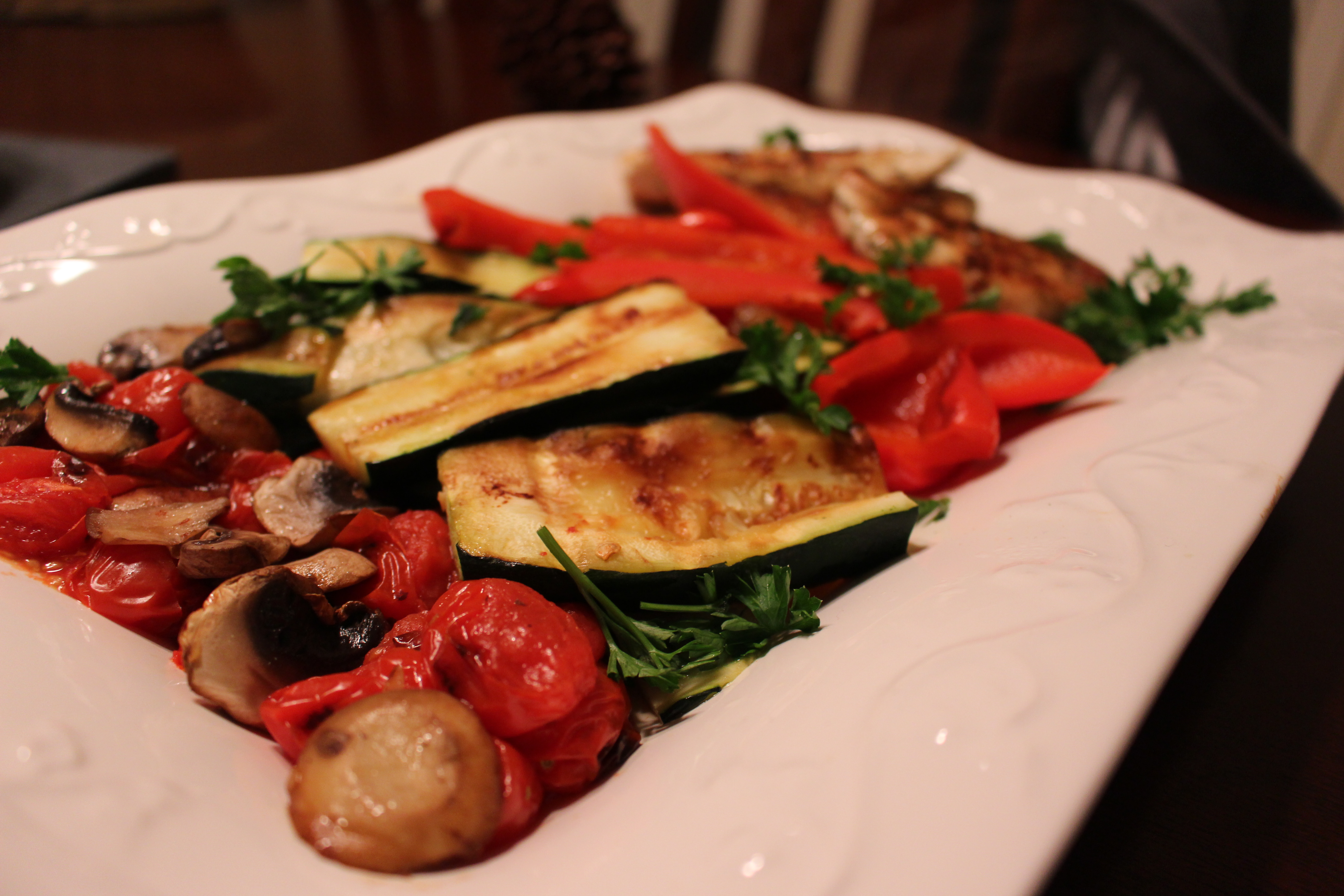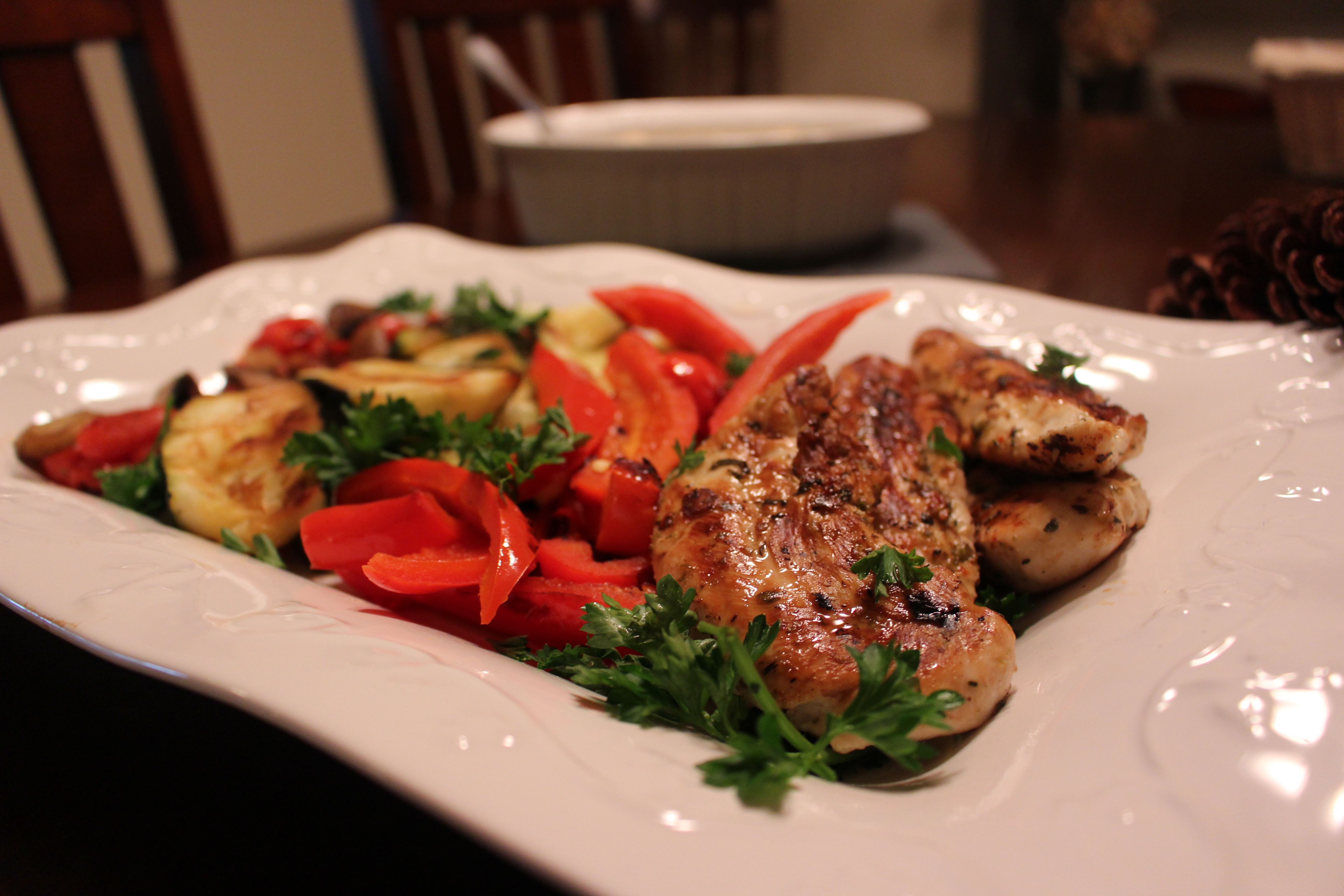2. Make the garlic dressing whisking together all ingredients. Brush the garlic dressing onto the vegetables then onto the chicken. If using a propane grill, create a foil basket by taking a large piece of foil, place the vegetables in the center, and fold up the edges. If using an electric grill or cast iron grill over the stove, as long as it is a non-stick surface, the vegetables can grill on that directly. Let the grill warm up then place the vegetables on the grill. Maintain the grill at medium to high heat and cook until the vegetables are tender. Remove vegetables and cover. Grill the chicken until fully cooked, turning once, for about 5-7 minutes.