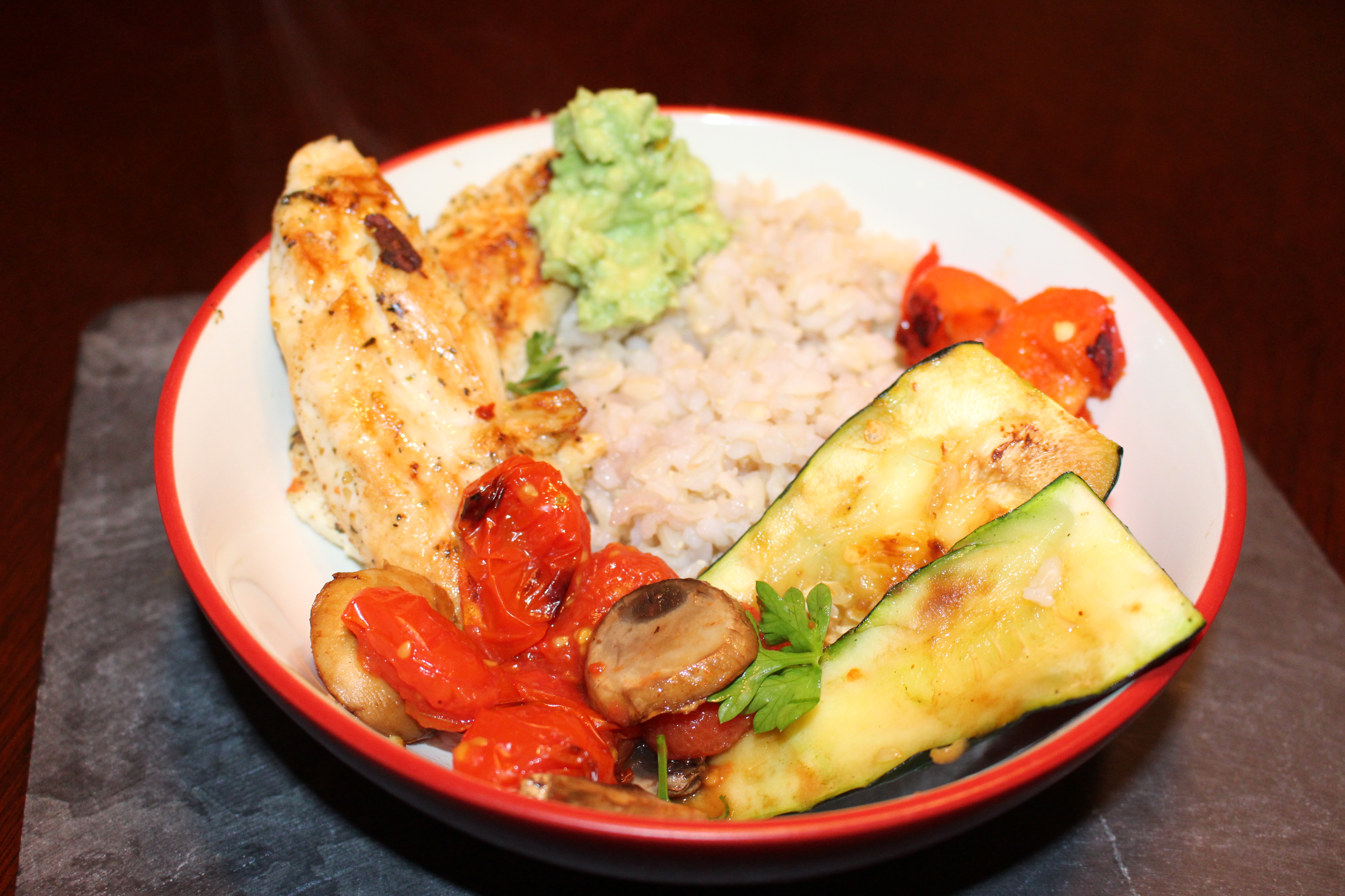 3. Assemble the bowl, beginning with rice followed by chicken and vegetables. Top with guacamole if desired.