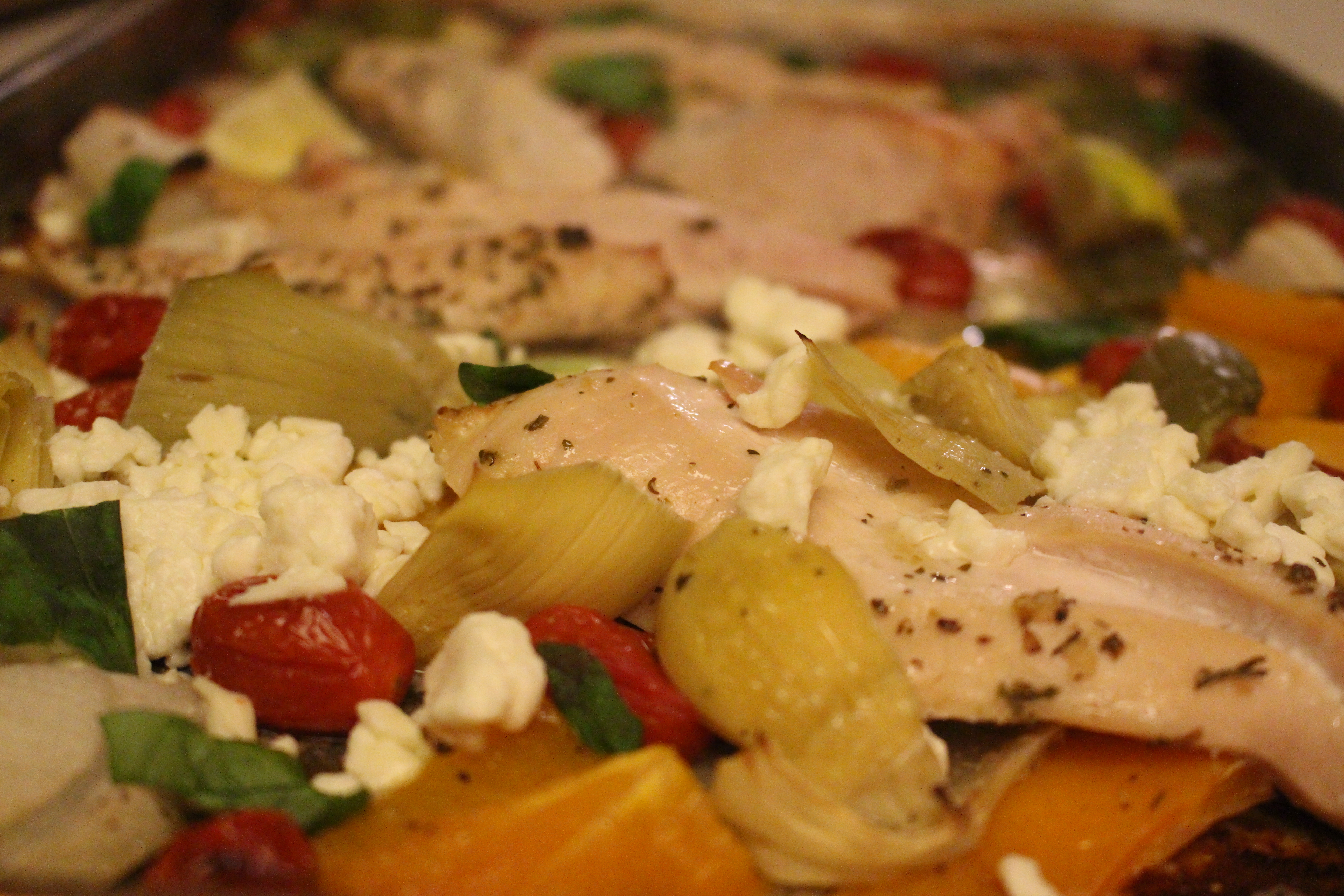 5. Add artichokes, feta, and fresh basil to the sheet pan and cook for an additional 5-8 minutes or until the chicken is cooked through.