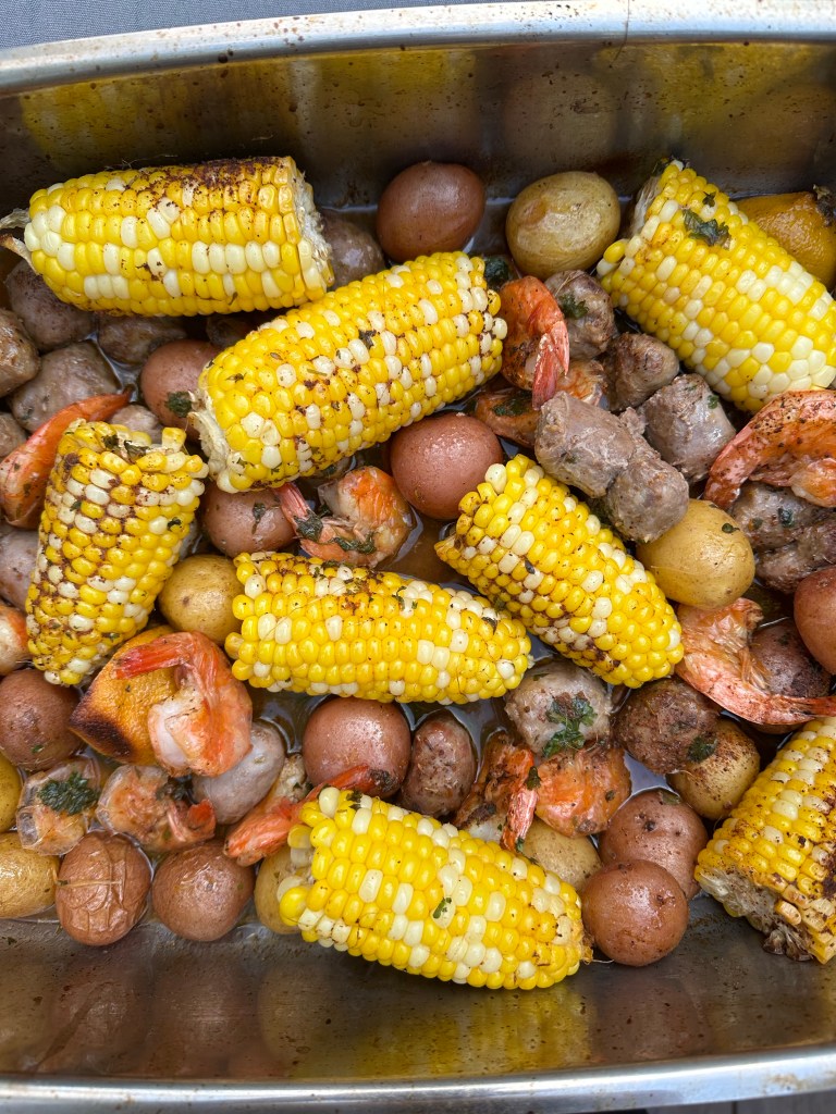 A few years ago, my cousin introduced me to this concept of a ‘foil boil’. We enjoyed a bunch of yummy seafood and sausage in a delicious cajun sauce in a big foil container and cooked it over the grill. It was divine! I’ve changed up this recipe a few times but this is the ‘base’ that I typically follow. The seafood may change as I’ve done this recipe with mussels or clams, chicken thighs, or different types of sausage and it always comes out great. You can really play around with it!