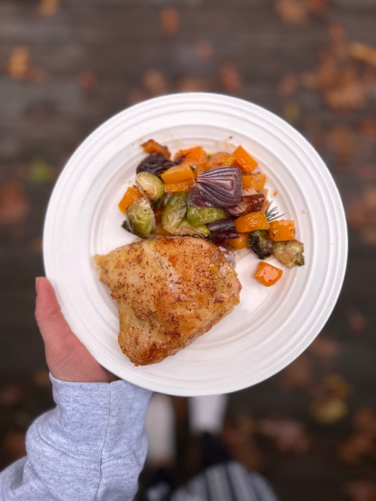 In the fall, I love all the seasoning veggies. In fact, they are veggies I will buy all year round, but certainly crave the freshness of the true in-season taste of said veggies. Brussel sprouts and maple are just so perfect, a match made in heaven. The fat from the chicken gives everything such a rich flavor. Letting the sheet pan heat up adds to the incredible flavor and texture of a crispy skin. I don’t eat all of the skin, but little bits here and there are just so good, especially the really crispy, nearly burnt pieces.